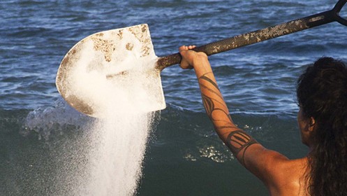| Inversão do açúcar (ou como fazer soro para curar uma ferida histórica) Levo para a praça da Independência 60 pacotes de 1kg de açúcar Caeté, um carrinho de mão e uma pá. Retiro cada saco de açúcar de um pacote de plástico apunhalando-os com um canivete usado na roça. O açúcar escorre ampulheta dentro do carinho de mão. Levo o carrinho cheio de açúcar do centro da cidade até a praia, por aproximadamente 4 km, em intenso desgaste físico. Encontro um lugar na praia, arrasto o carrinho até a beira do mar, e com a pá coleto o açúcar e despejo no mar até que este acabe. Fotos: Juan Montelpare |